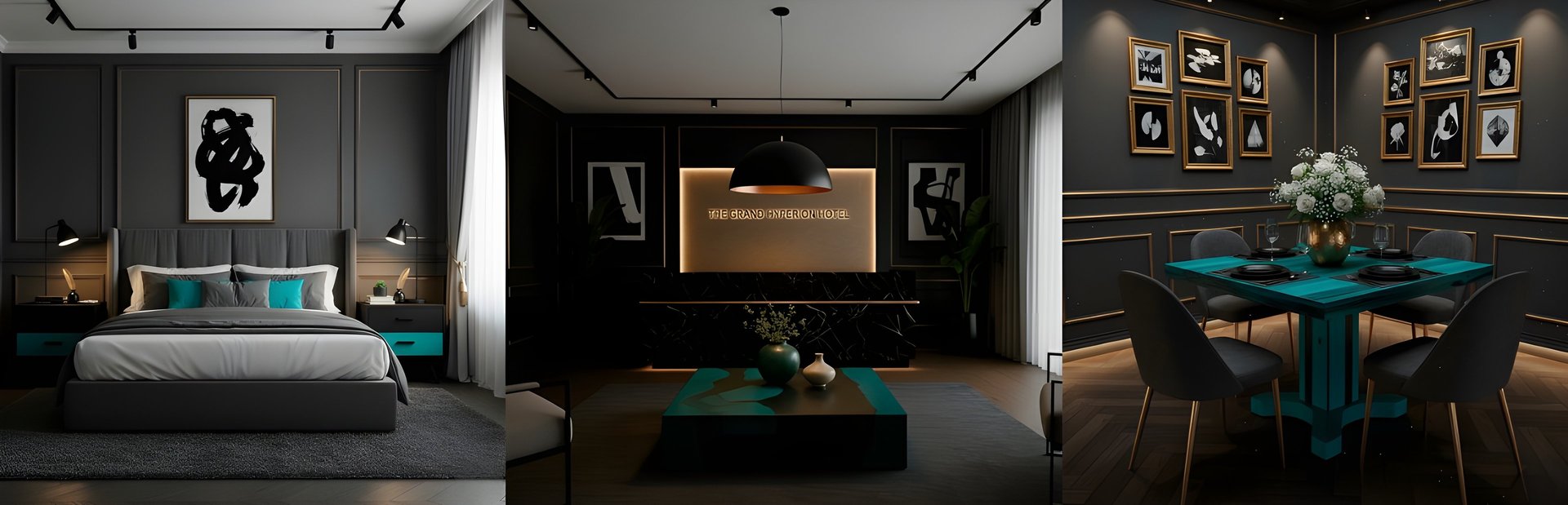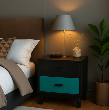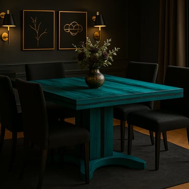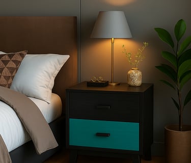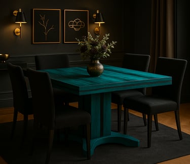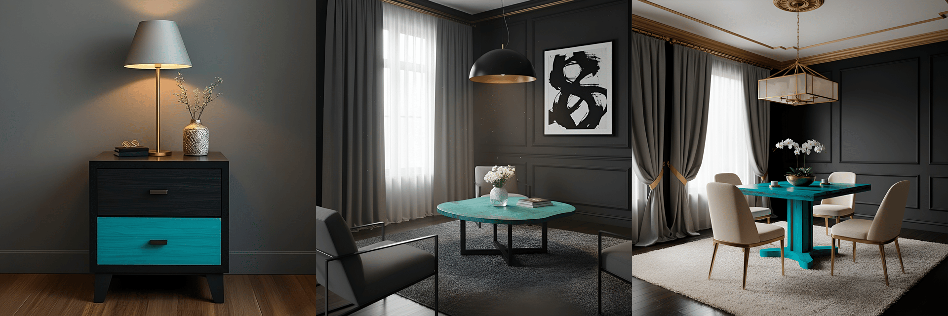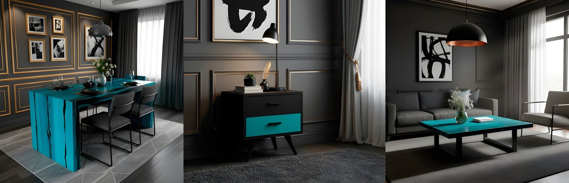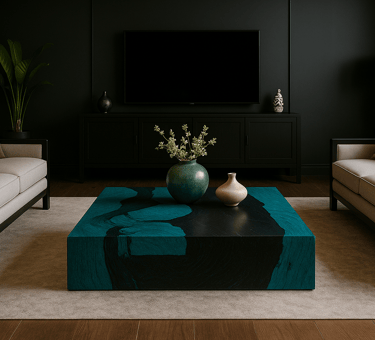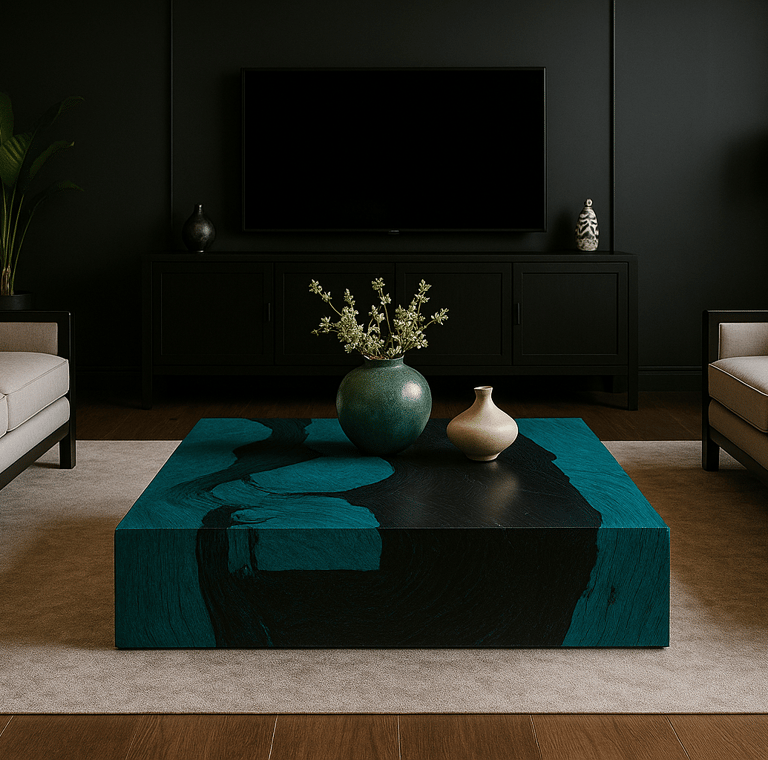 We work with wood, but what matters is what each shape, each shadow, each contrast between turquoise and black conveys. These aren’t background pieces. They take the lead, wherever they are.
